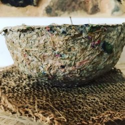 Initial experiments together produced exciting results. Building on these Caroline has used grass pea from the roots to the flowers to produce a diverse a variety of paper and plant-based surfaces including fabrics as well as objects such as bowls.