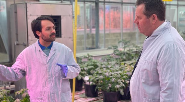 CAPTION – Researcher Thomas Navarro talks to Defra Minister Rt Hon Mark Spencer about gene-edited potatoes with enhanced nutritional, processing and storage qualities.