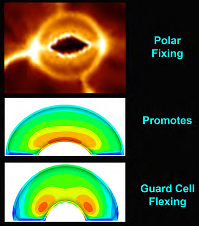 Using atomic force microscopy and computer modelling the team noticed an unexpected stiffening in the guard cell end regions, or poles.