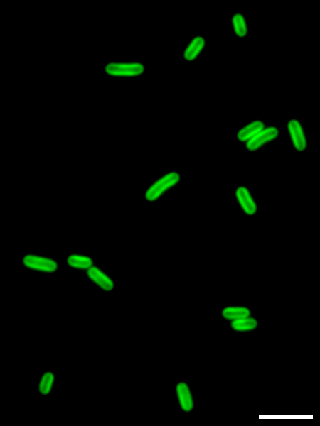Microscopy image showing cells of the wild-type cyanobacterium species used in the study. Autofluorescence was pseud-coloured as bright green. Scale bar is 5 micrometers.
