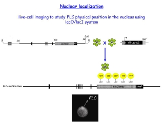 To investigate the relationship between nuclear organisation, chromosome interaction and histone modifications they have developed a set of tools based on the lacO/lacI system, which enable them to perform live cell imaging on the FLC locus. This revealed a cold-induced physical clustering of FLC alleles.