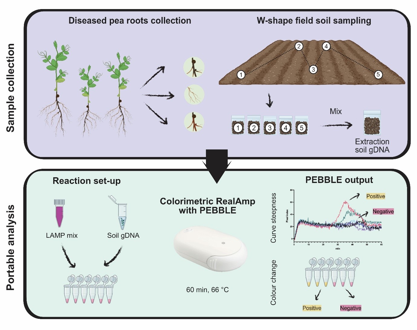 Our LAMP assay demonstrates high specificity and sensitivity in both soil and infected root tissue. Results are generated within 60 minutes, providing a rapid and cost-effective alternative to conventional diagnostic methods (see Figure 2 for the proposed on-farm diagnostic workflow).