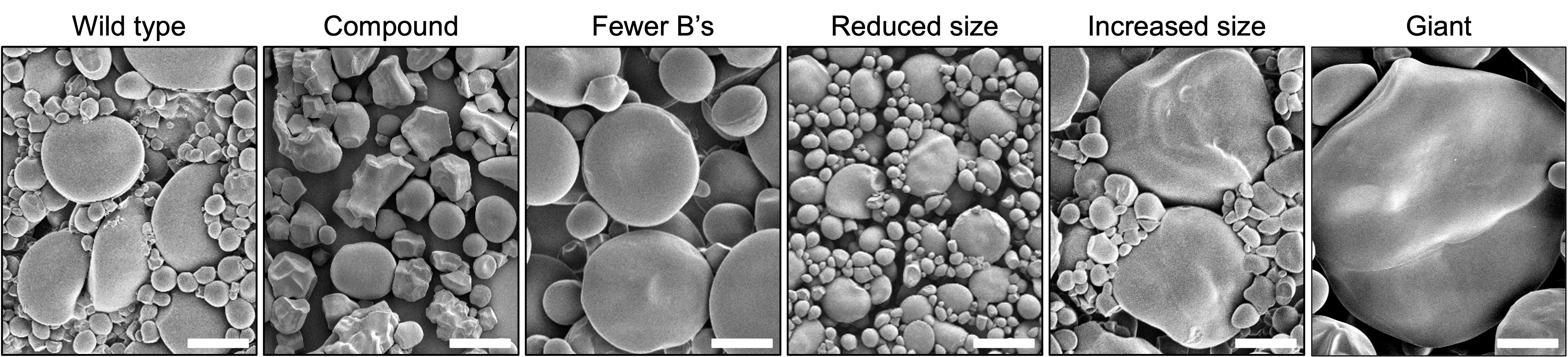 - Induced variation in genes, which allows engineering of starch granule shape and size in wheat and potato. These starches are useful for modifying starch viscosity and cooking properties, which affects processing quality and resistance to digestion in the gut. We are testing applications of our novel starches in collaboration with the Quadram Institute and various industrial partners.