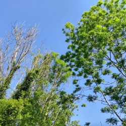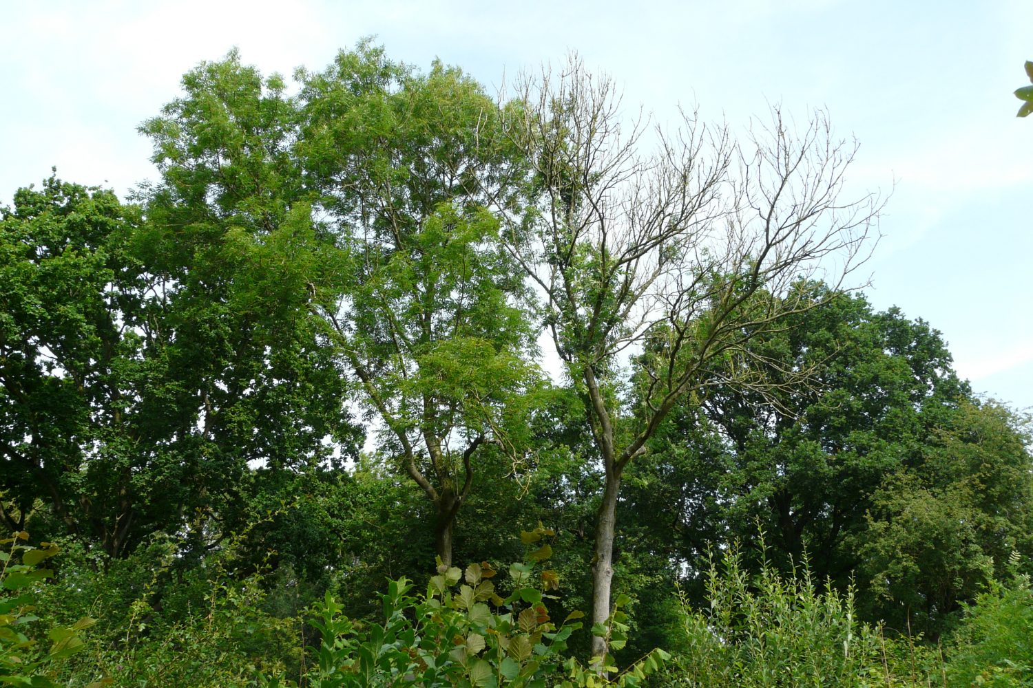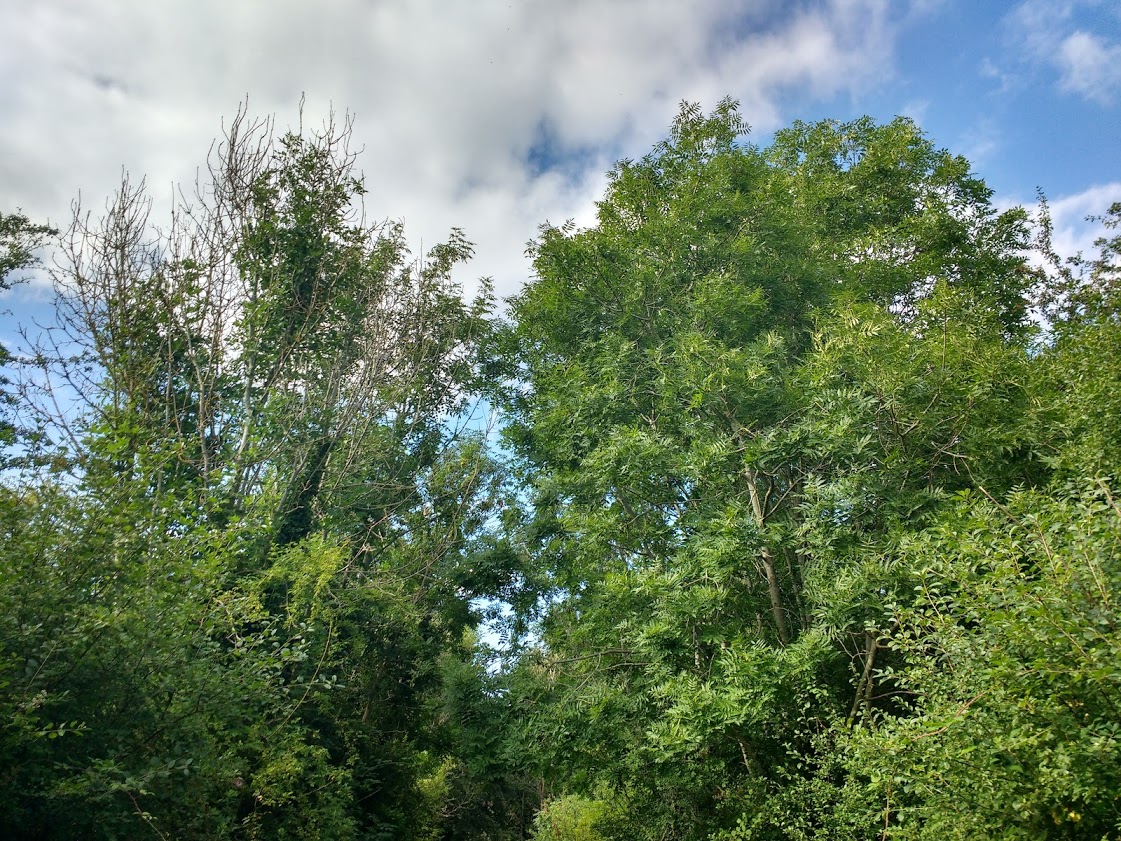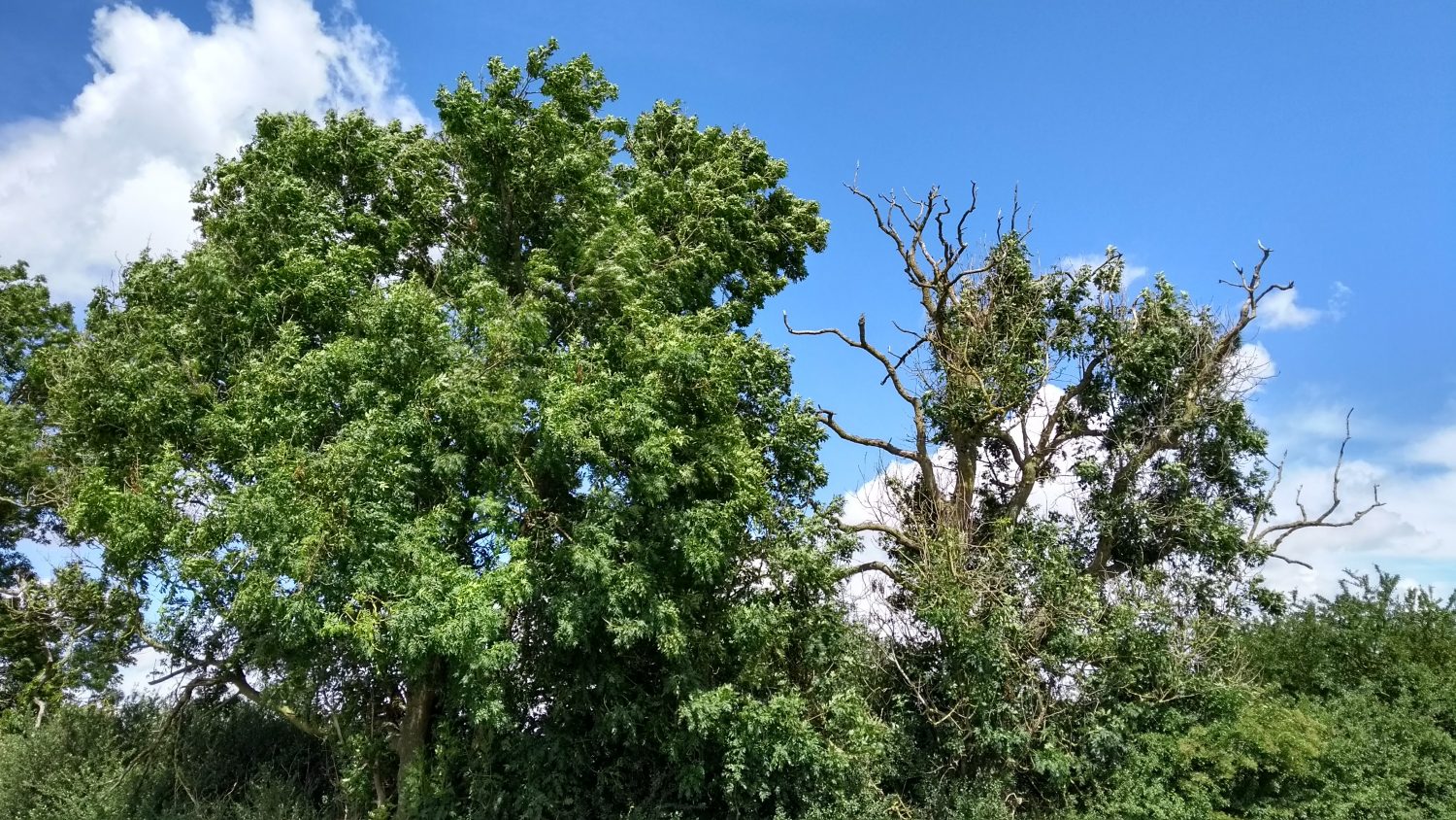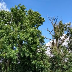 In East Anglia, many ash trees have succumbed to ash dieback. We are looking for ash trees which are obviously much healthier than other ash nearby, as in the examples below.