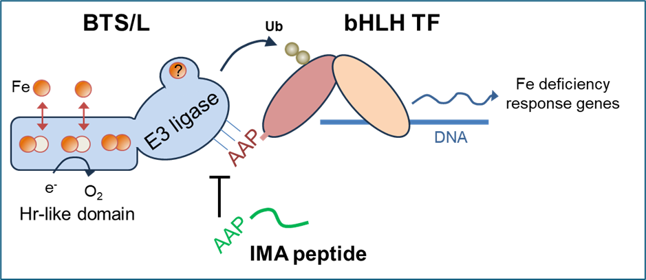 Our in-depth functional analysis of the two redundant BTSL genes in Arabidopsis showed that the transcription factor FIT is a likely substate protein. FIT is a central player in the transcription cascade enabling the response to iron deficiency, by inducing the expression of genes for iron uptake. We found that BTSL2 protein interacts directly with FIT in vivo and in vitro, and btsl1 btsl2 double mutants have sustained levels of FIT when moved from iron deficiency to resupply (Rodriguez-Celma et al 2019 PNAS).